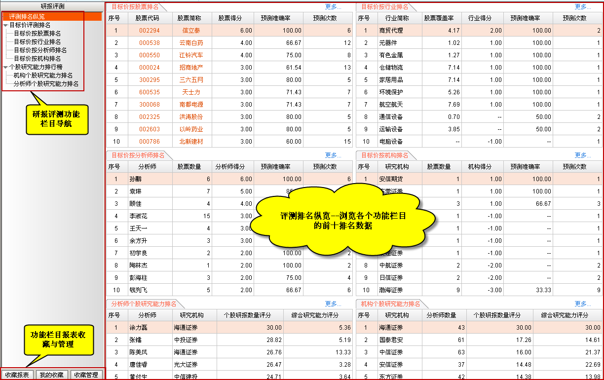 评测排名纵览可以概览目标价按照股票排名、目标价按照行业排名、目标价按照分析师排名、目标价按照机构排名、机构个股研究能力排名、分析师个股研究能力排名六种排名方式的前十位排名情况,并且可以通过“更多···”导航至具体的功能栏目查看更加详细的排名结果