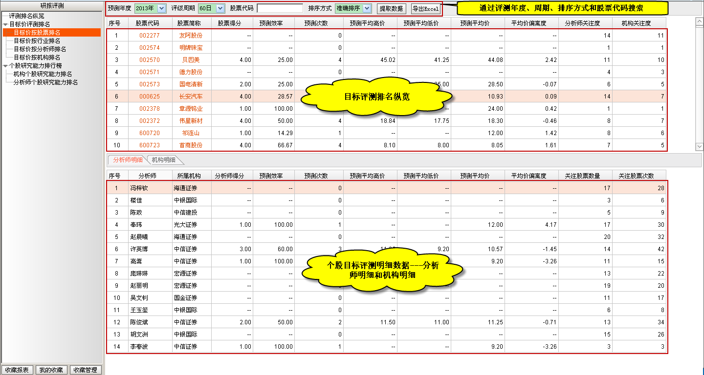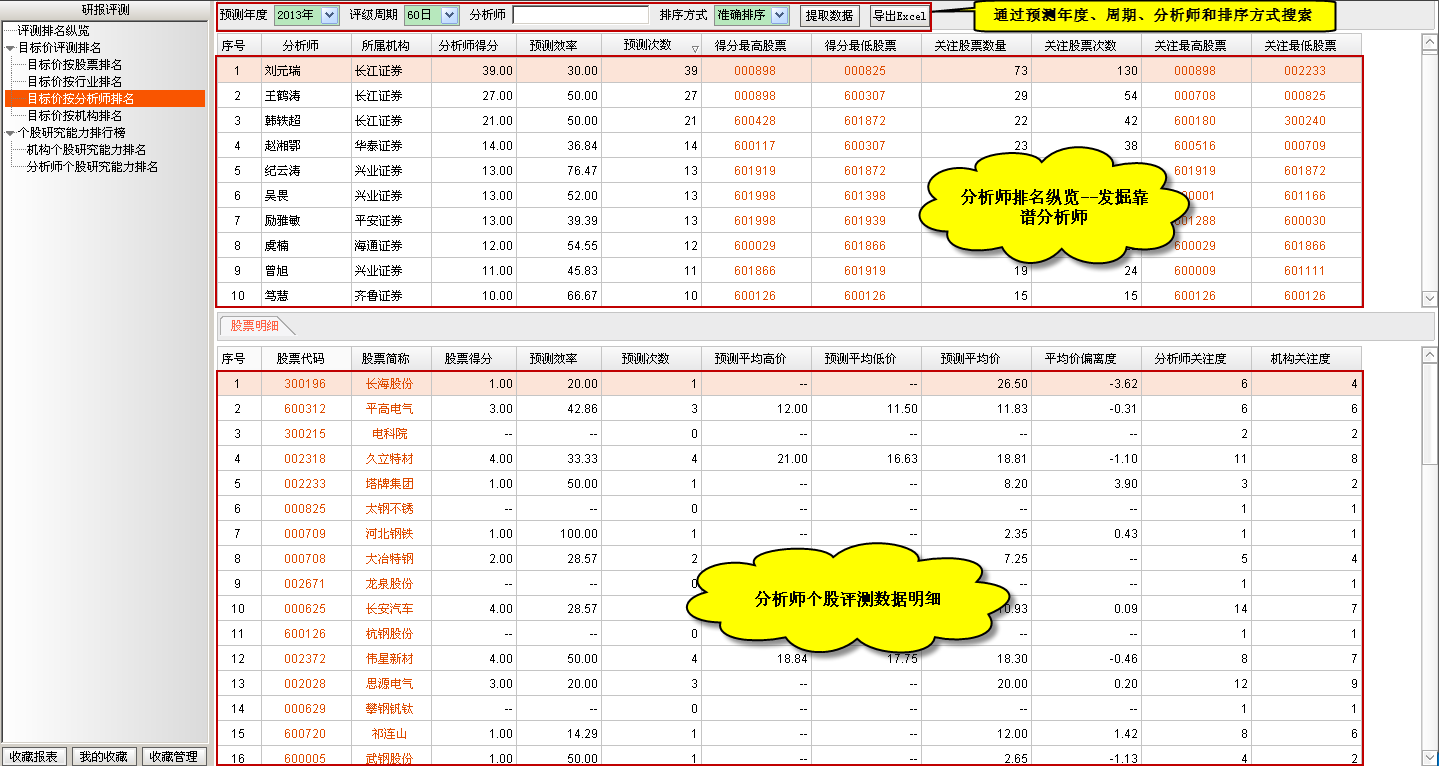 目标价按分析师排名主要是通过统计分析师研究的所有个股的关注次数、预测次数、预测准确率、关注最高股票等指标来评估分析师的个股预测能力,进而发现优秀的个股分析师,同时提供对应分析师的个股预测明细。