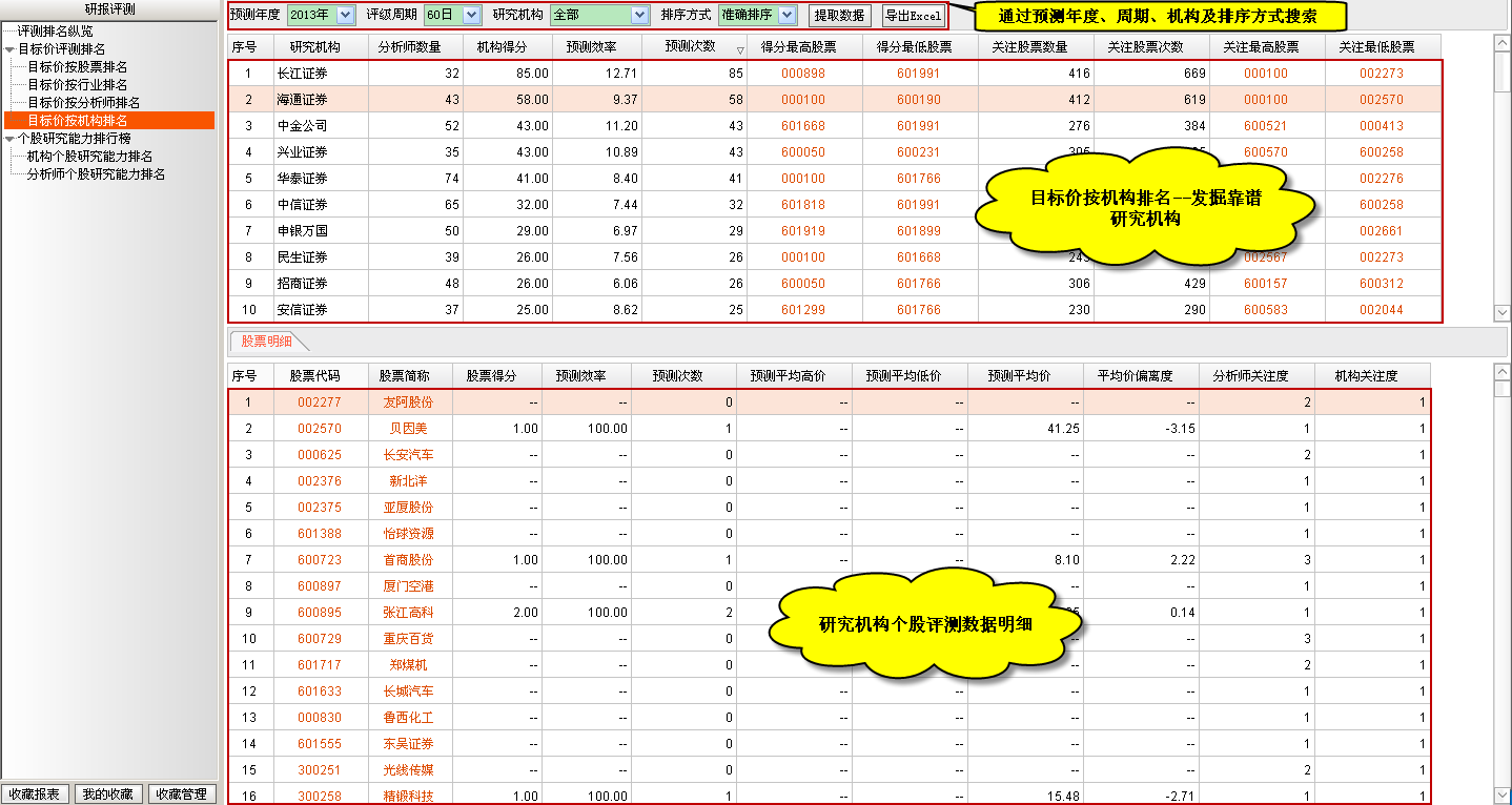 目标价按机构排名主要是通过统计研究机构研究的所有个股的关注次数、预测次数、预测准确率、关注最高股票等指标来评估研究机构的个股预测能力,进而发现靠谱的研究机构,同时提供对应研究机构的个股预测明细。