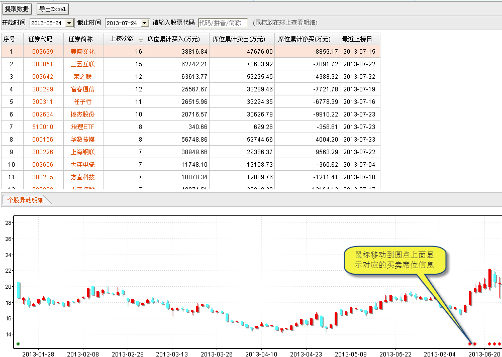 "席位活跃度分析"可以按时间区间,异动类型统计席位的上榜次数以及席位所对应的明细信息,如下图: