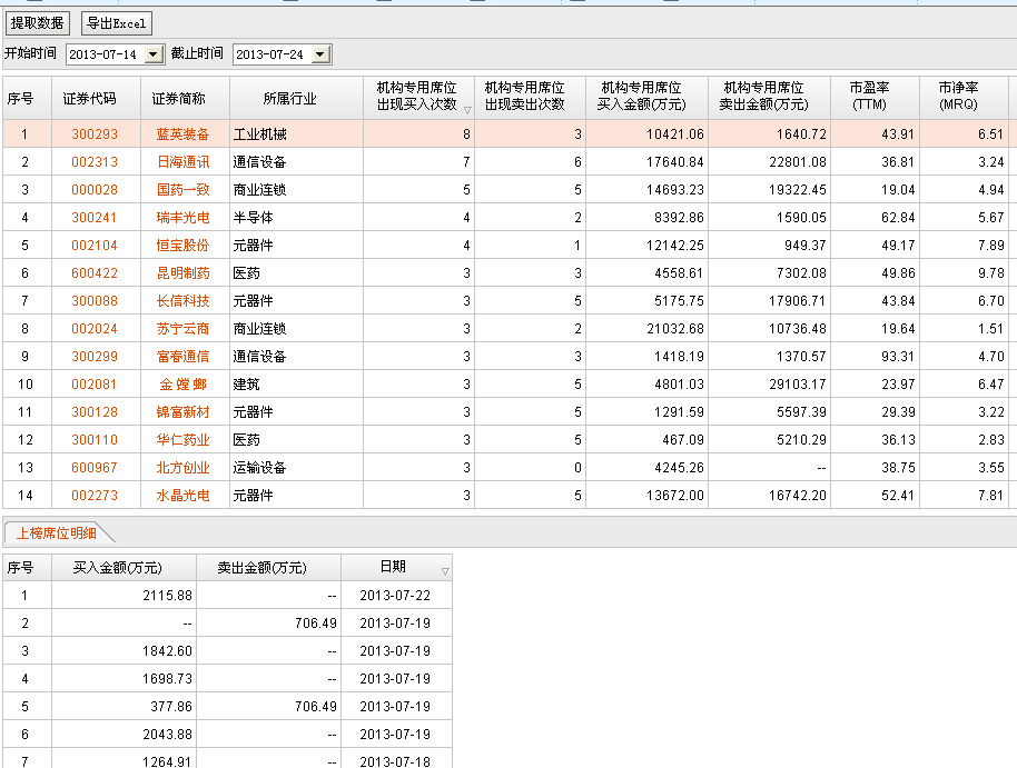 "机构专用席位跟踪"可以查看时间区间内机构专用席位的龙虎榜统计信息,如下图所示: