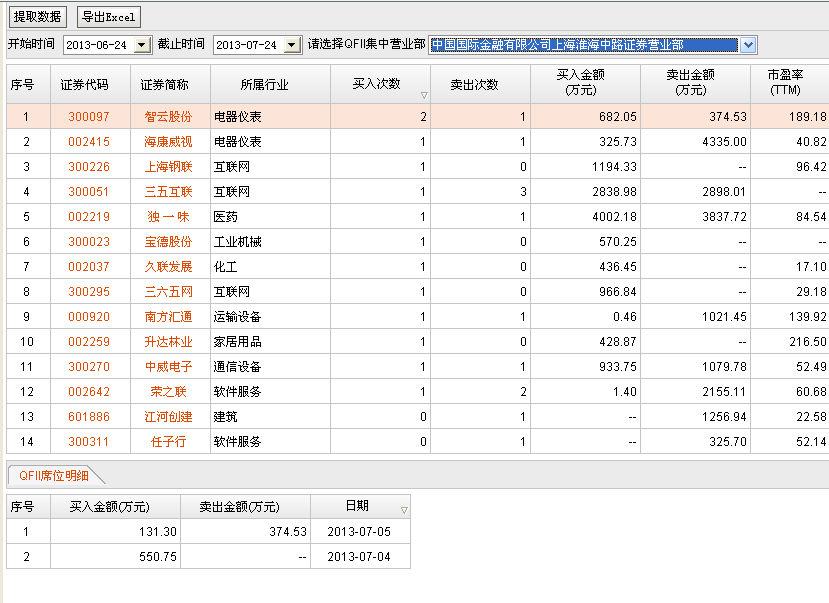 "QFII集中营"对时间区间内QFII集中的几个营业部做汇总统计,如下图: