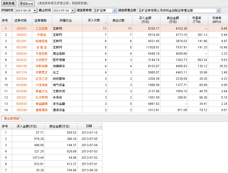 "龙虎榜单"可以按时间区间,异动类型,股票代码查询对应的龙虎榜单信息;点击列中的某一条数据,下面显示对应的买卖营业部信息,如下图所示:
